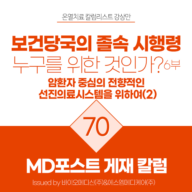[온열치료칼럼 70편] 보건당국의 졸속 시행령, 누구를 위한 것인가? (6부)-암환자 중심의 전향적인 선진 의료 시스템을 위하여(2) 지난 칼럼에서는 보건 당국의 시행령이 솔족으로 이뤄진 과정에 대한 배경과 그로 인해 암 환자들의 권리 침해 우려를 다루었다. 이어지는 이번 칼럼에서는 이러한 문제의식을 바탕으로 신의료...
